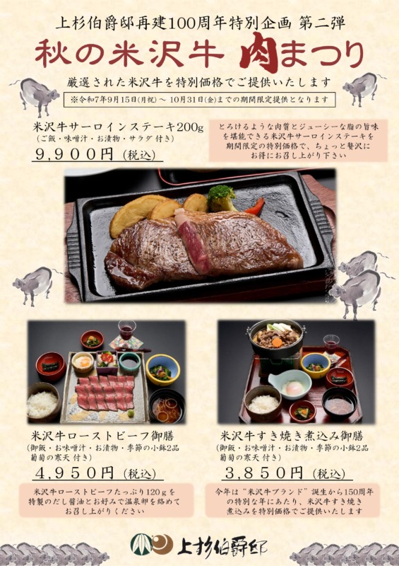 10月31日まで 上杉伯爵邸再建100周年特別企画 第二弾「秋の米沢牛 肉まつり」開催!