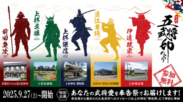 山形県米沢市の上杉文化エリアで、歴史ファンも旅好きも楽しめる新しい体験型周遊企画「米沢五武将印めぐり」が、2025年9月27日(土)より始まりました。