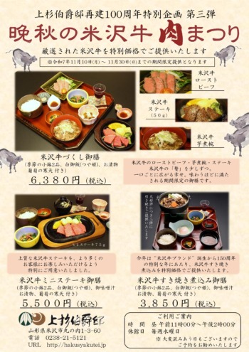 11月30日まで 上杉伯爵邸再建100周年特別企画 第三弾「晩秋の米沢牛 肉まつり」開催!